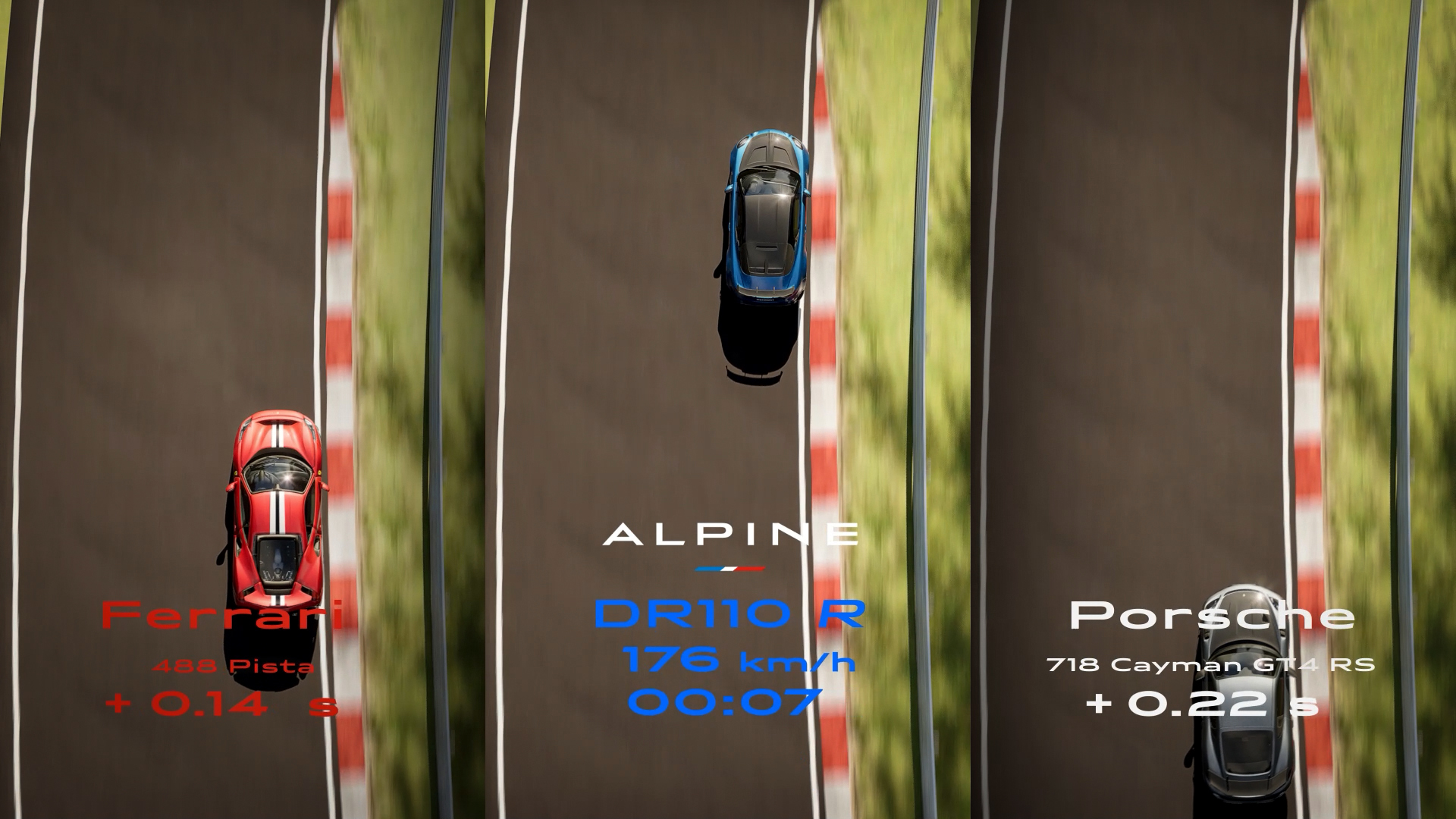 Illustrer la performance de l’A110 R Ultime face à ses deux concurrentes sur circuit en simulant en temps réel le comportement des véhicules - vitesse, tenue de route, affichage des temps et écarts afin d’offrir une comparaison dynamique et crédible.
